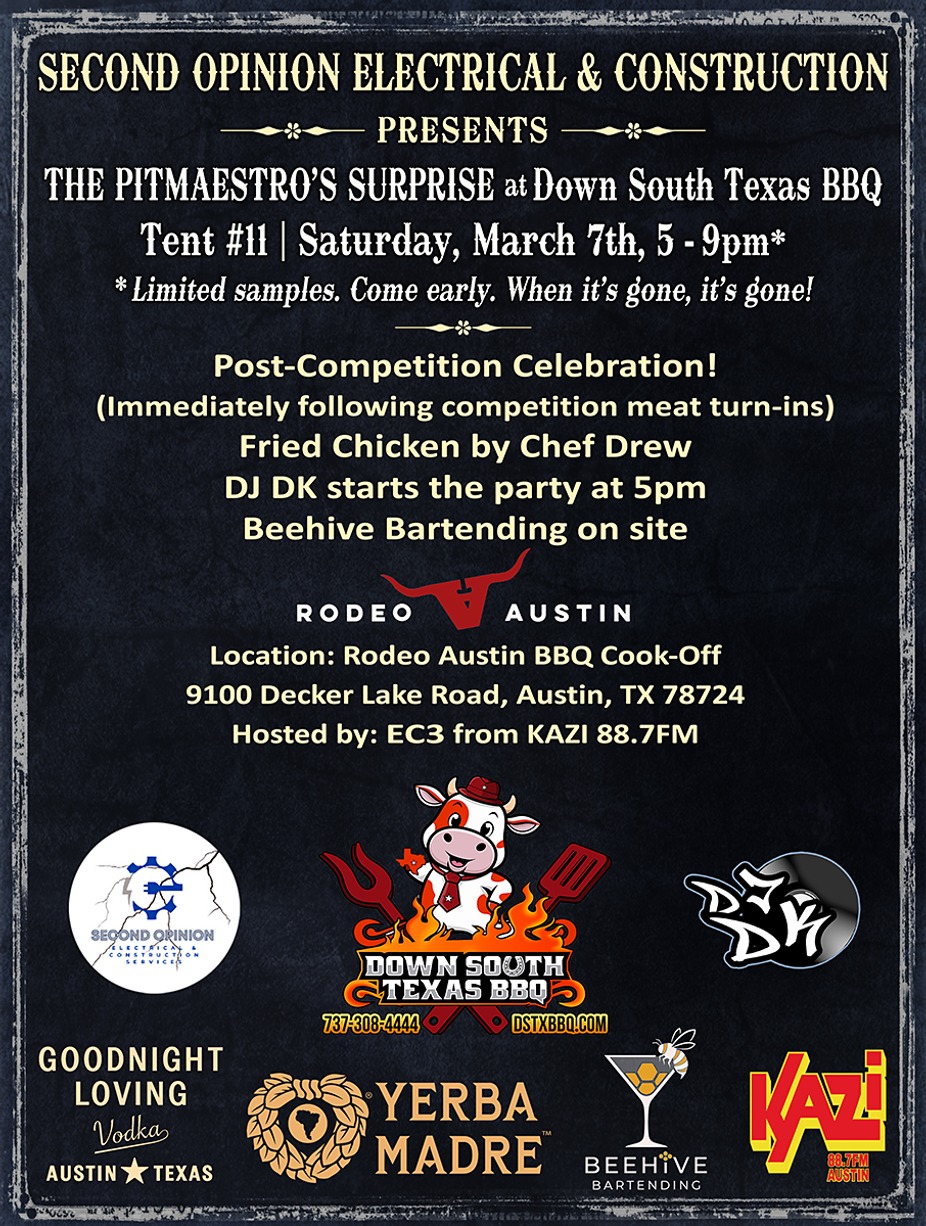Join us at Rodeo Austin BBQ Cook-Off for The Pitmaestro’s Surprise — a post-competition celebration hosted at Tent #11.